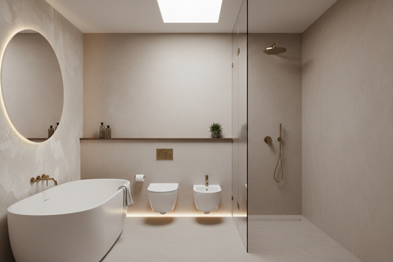 Микроцемент - один из самых популярных материалов для ванных комнат. Он образует бесшовное влагостойкое покрытие, подходит для стен, пола и душевых зон.
