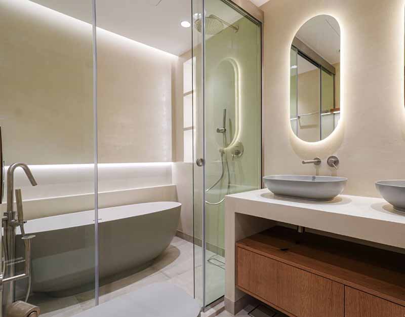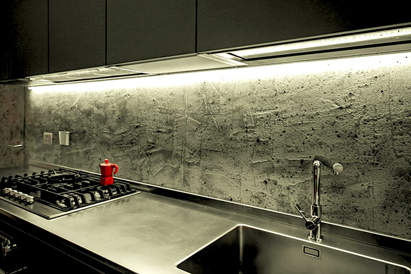 Лучшая комбинация — микроцемент + дерево или стекло. Если добавить подсветку, покрытие приобретает глубину и фактуру, визуально заменяя декоративные панели.